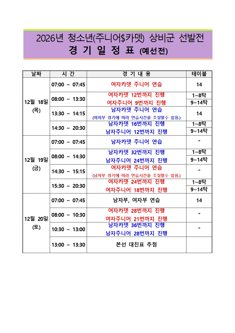 제9회 한국중고등학교 탁구 최강전 겸 2026년 청소년(주니어&카뎃) 상비군 선발전 경기일정표