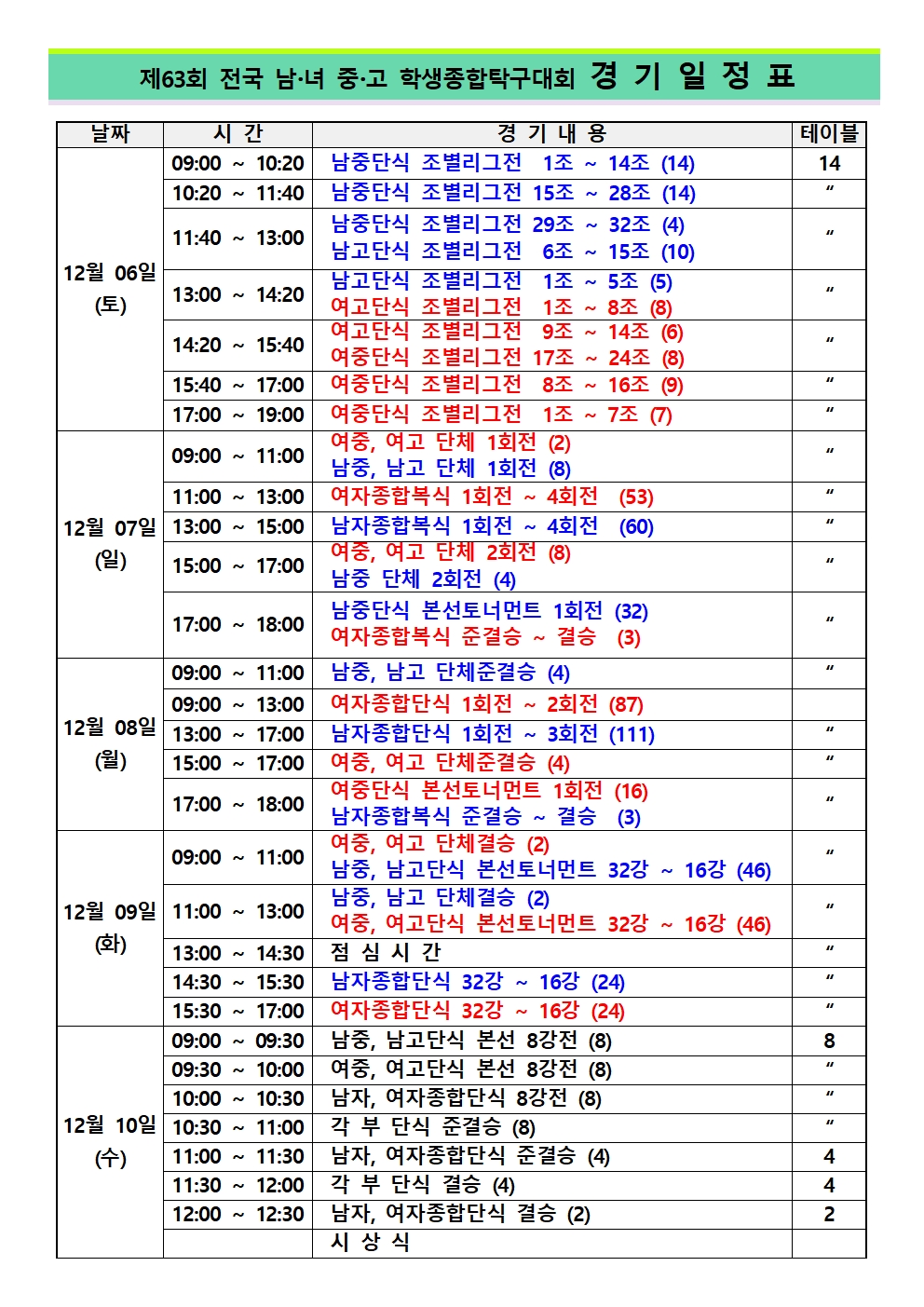 제63회 전국 남녀중고학생종합탁구대회 경기일정표